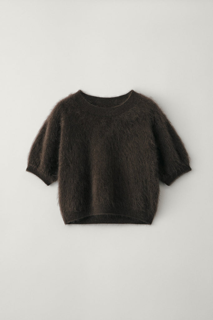 A sumptuous top with texture, the Juniper sweater is knitted in our signature brushed cashmere drawing from the sheen and luster of mohair. The generous fit, slightly cropped silhouette is complete with a crew neck, dropped shoulders and short sleeves.