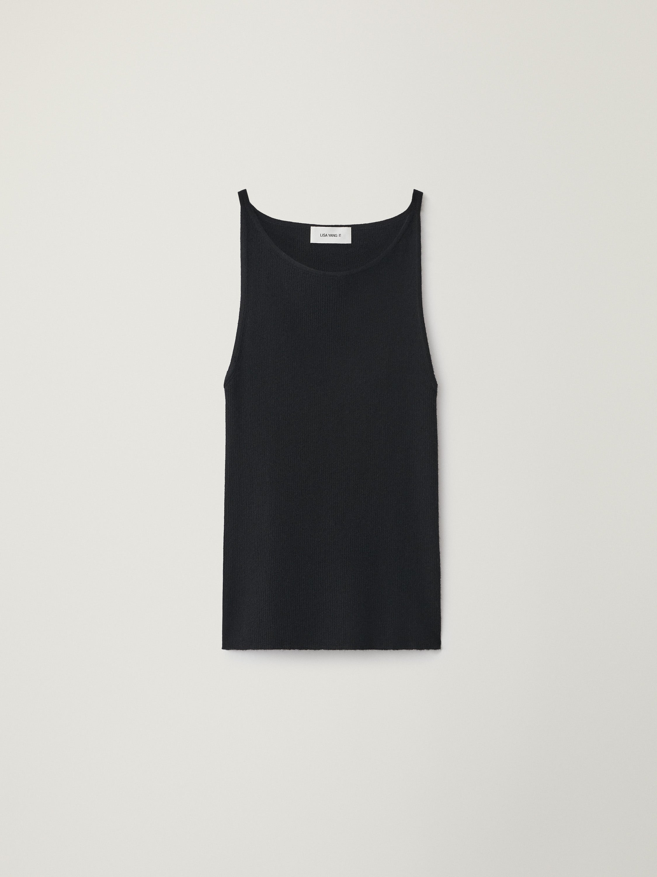A light and layerable tank, the Lynette top is knitted in our fine knit cotton cashmere composition with a delicate rib pattern. The close-fitting silhouette features a high boat neck, a tubular armhole and a hip-length hem.