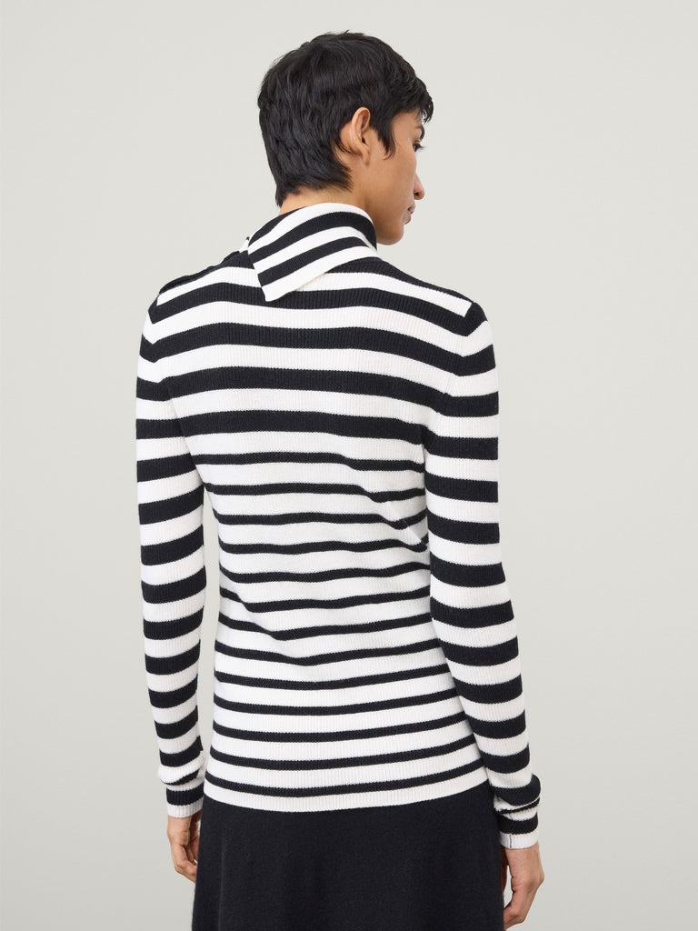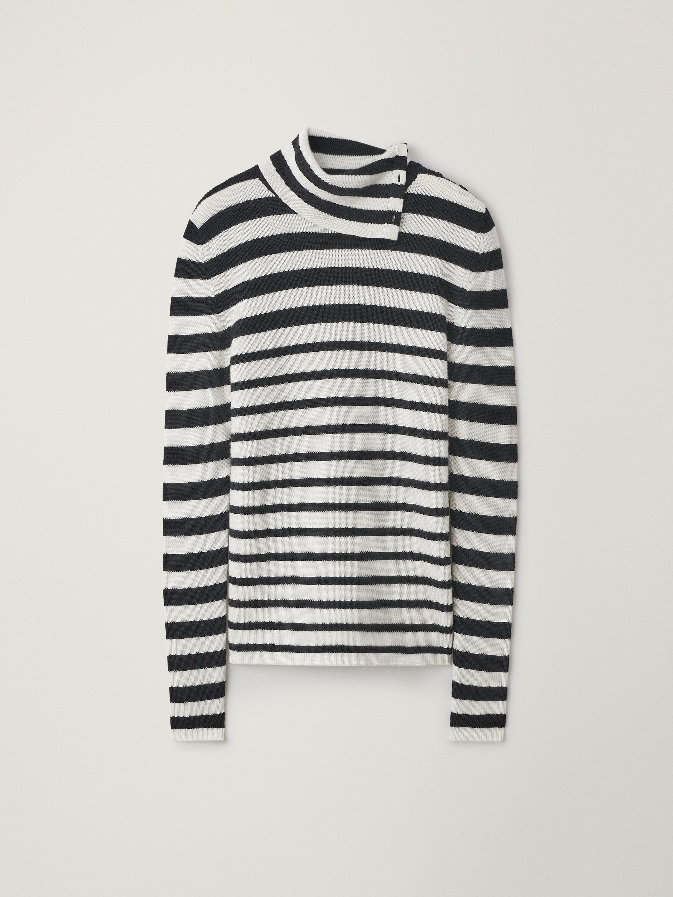 An asymmetric silhouette, the Sabrine sweater is crafted in our ribbed jersey-like cotton cashmere composition. The regular fit, hip-length silhouette features a high neck detailed with buttons, full-length sleeves and a clean hem.