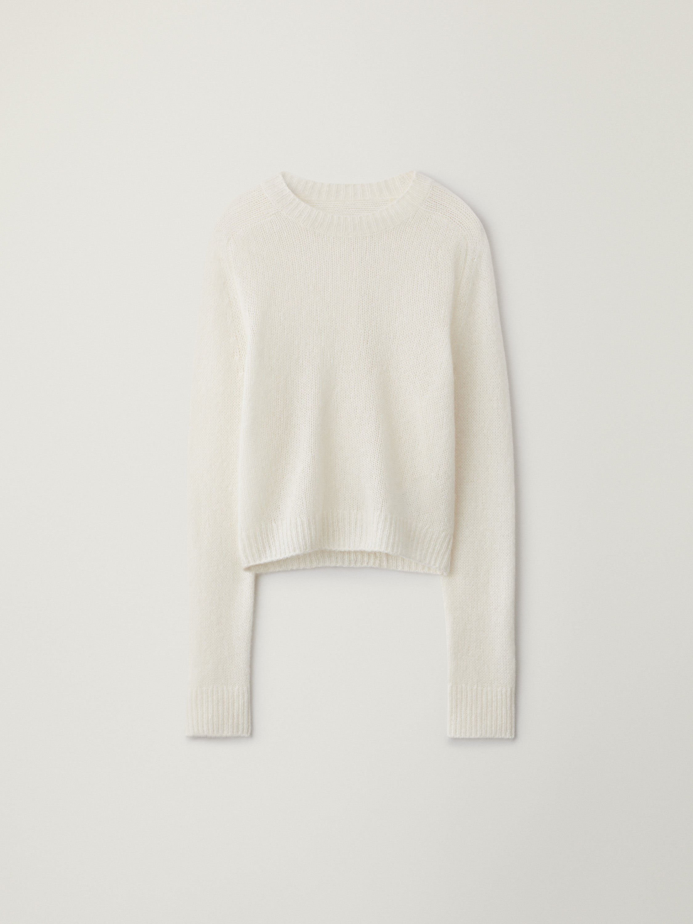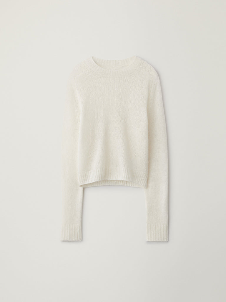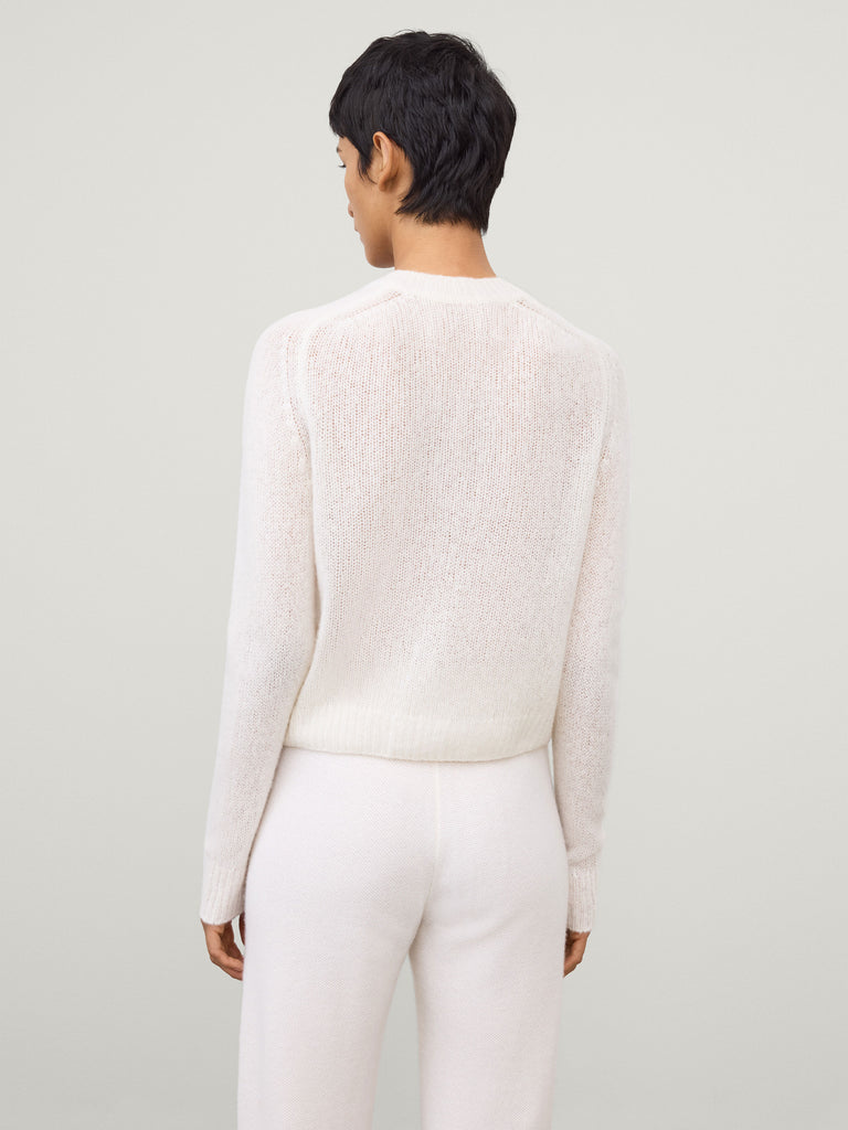 A new spring go-to, the Solene sweater is crafted in textured silk cashmere with a light and lofty hand feel. The regular fit, cropped silhouette features a round neck, a raglan shoulder, full-length sleeves and a ribbed hem.