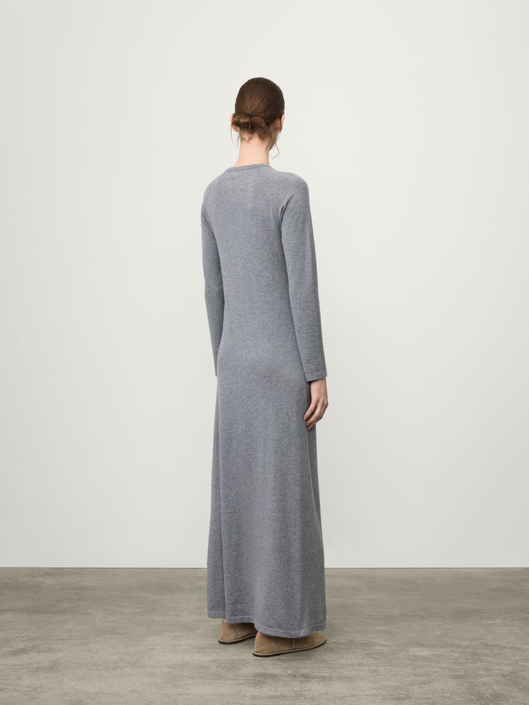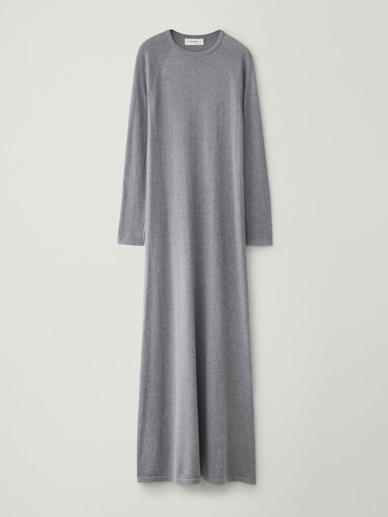 A dress with maxi proportions, the Eliora dress is crafted in our fine knit cotton cashmere composition suggestive of jersey. The regular fit piece skims the body in a slightly A-line silhouette that feels both light and enveloping, and features a crew neck, full raglan sleeves and a floor-gracing skirt with ribbed trims.