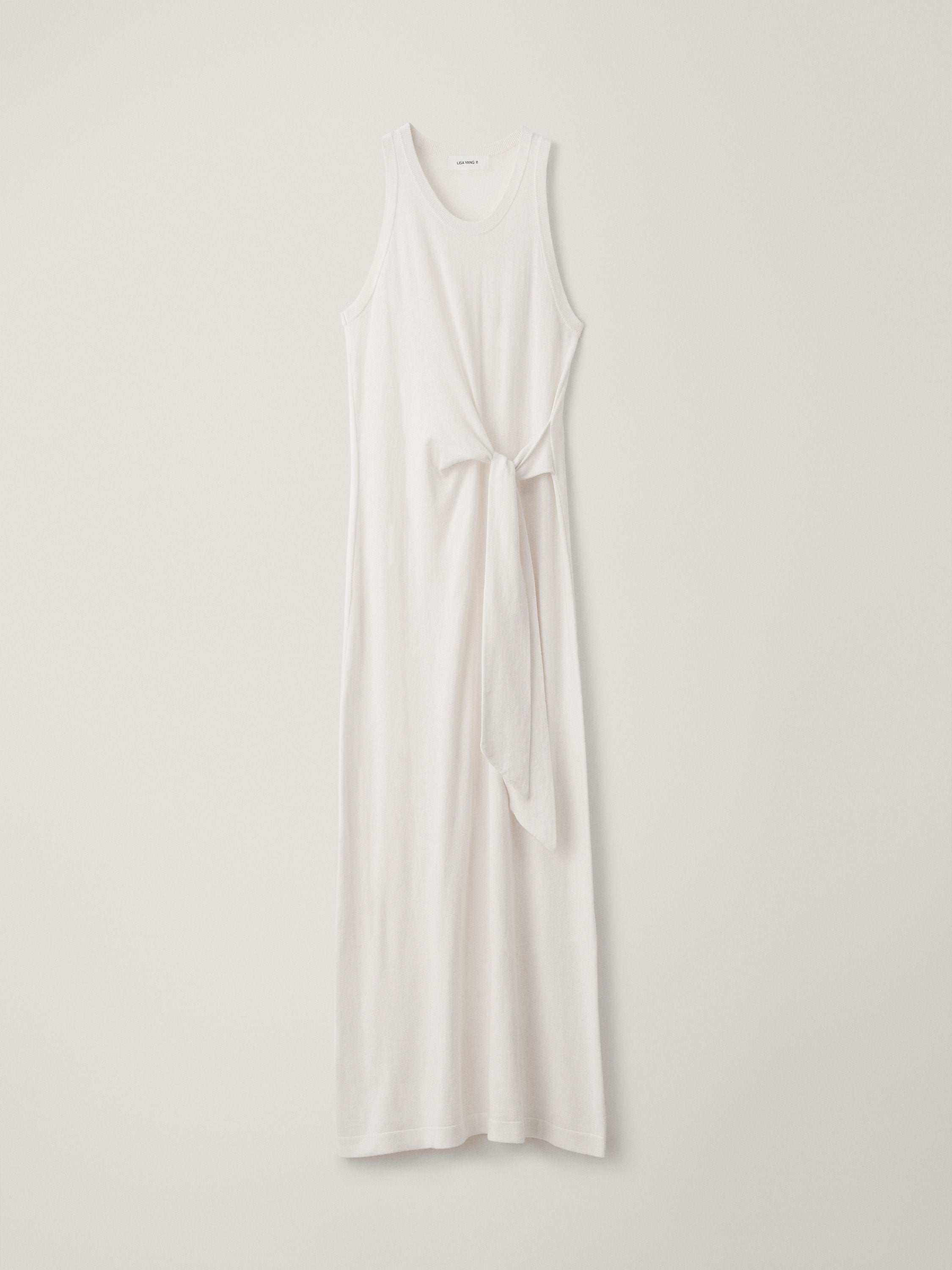 An asymmetrical statement piece, the Angeline dress is crafted in our fine knit cotton cashmere composition with a technical, one-piece construction. The regular fit, figure-skimming silhouette features a round neck, a tie knot detail that creates a chic drape along the front, a maxi skirt with a tubular hem and ribbed trims.
