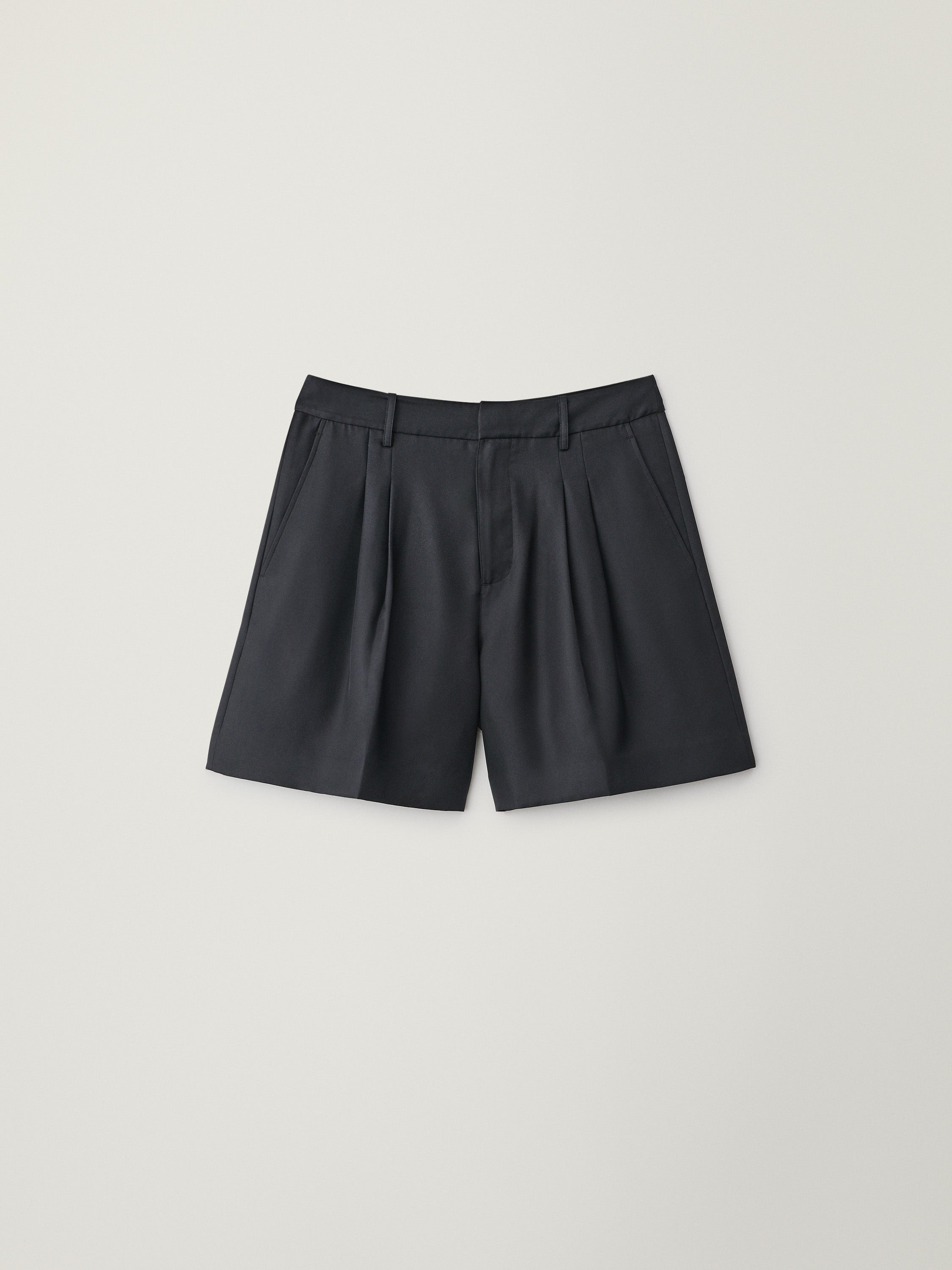 A tailored articulation of silk, the wide leg tailored shorts are crafted in woven silk twill with a subtly shiny finish. The relaxed fit, straight silhouette falls from a high waist with belt loops to cropped legs with folded pleats, and is detailed with side pockets.