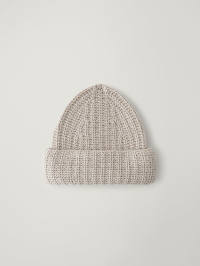 In a chunky, 3-gauge ribbed plain knit silhouette, the Beatris beanie has a triple rolled edge that can be worn folded or extended.