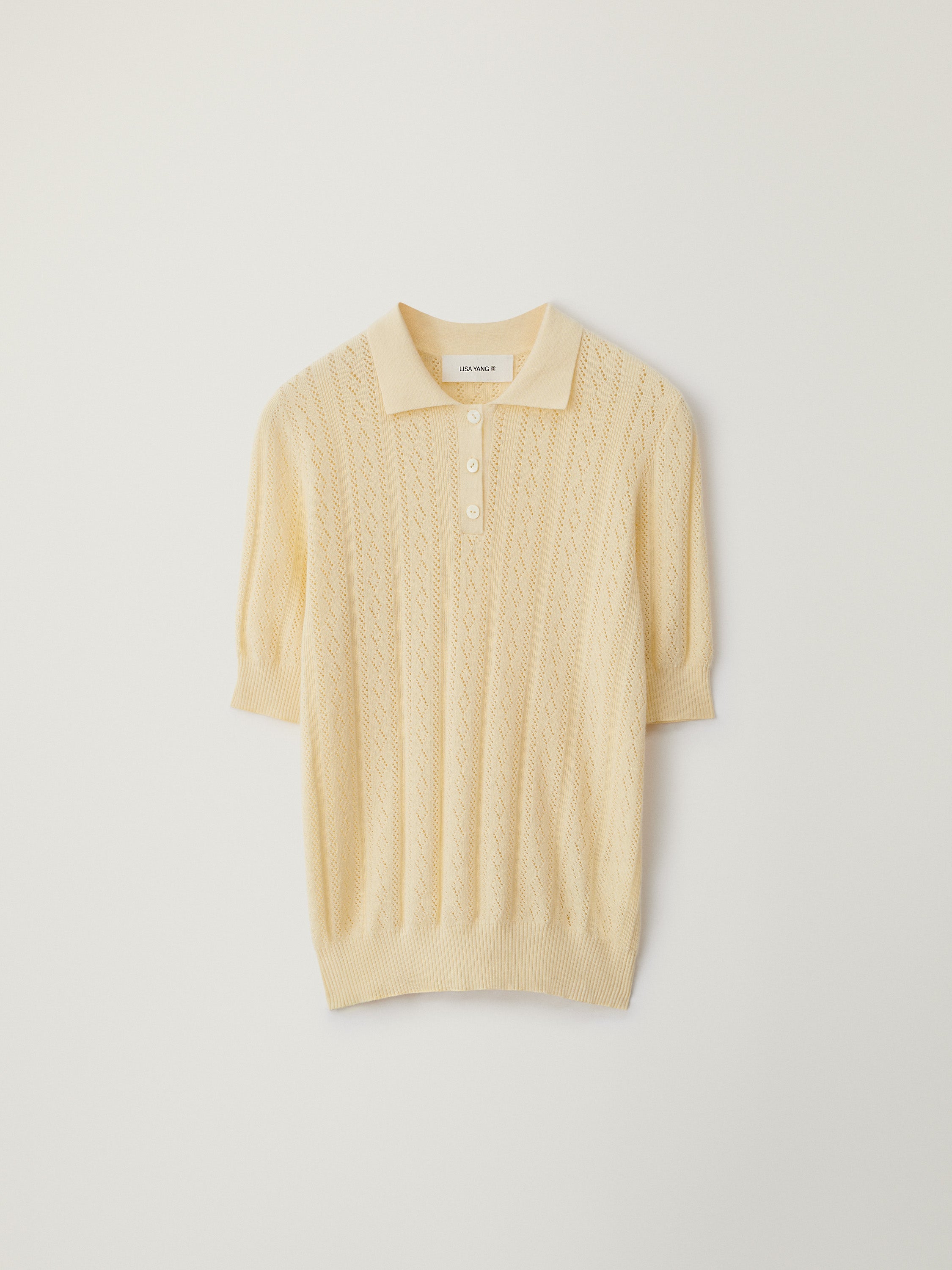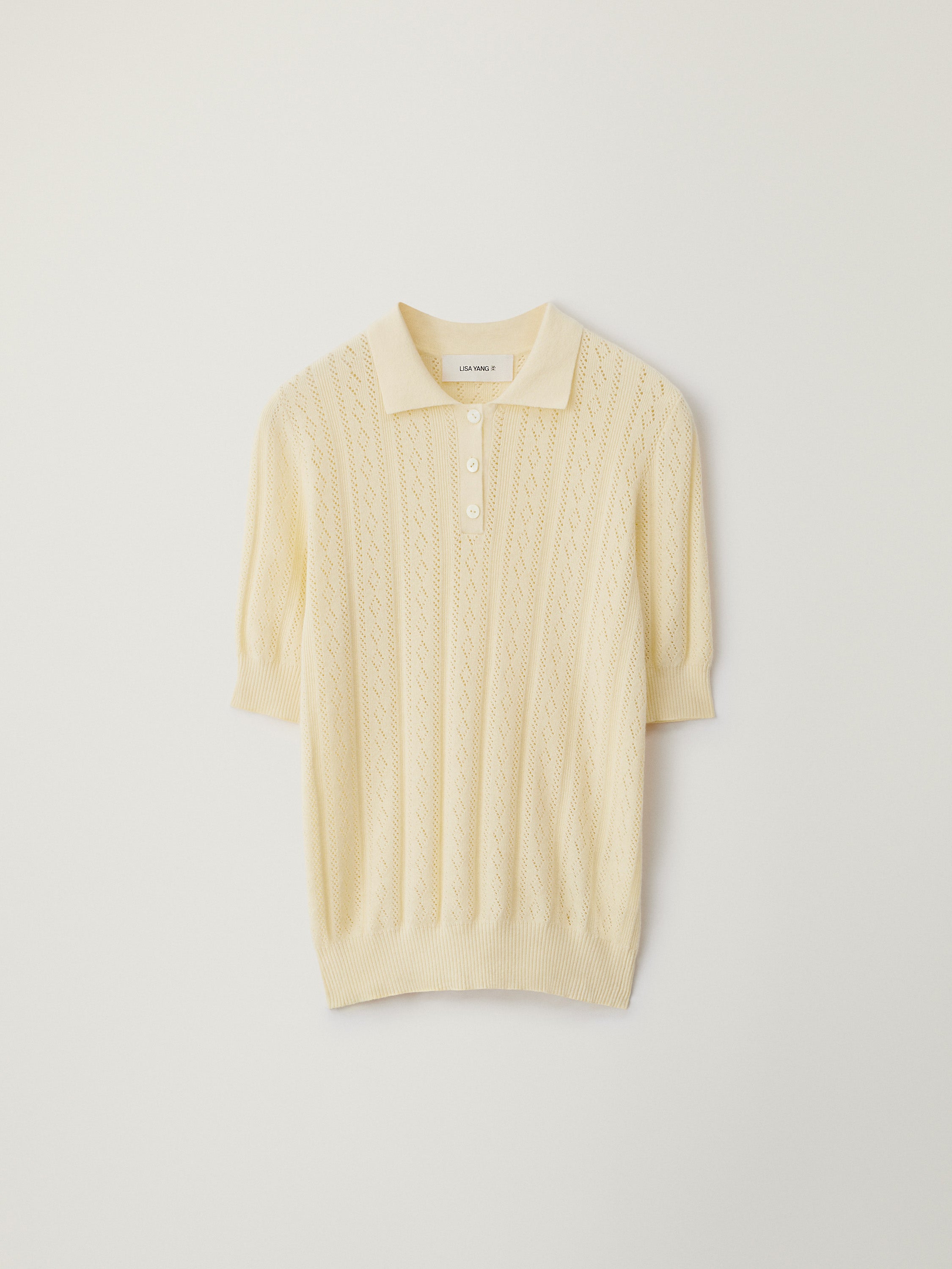 A feminine new top, the Cristine sweater is crafted in pointelle knit cotton cashmere with delicate, lace-like structures. The fitted, hip-length silhouette features a preppy polo shirt neckline, short sleeves and ribbed trims.