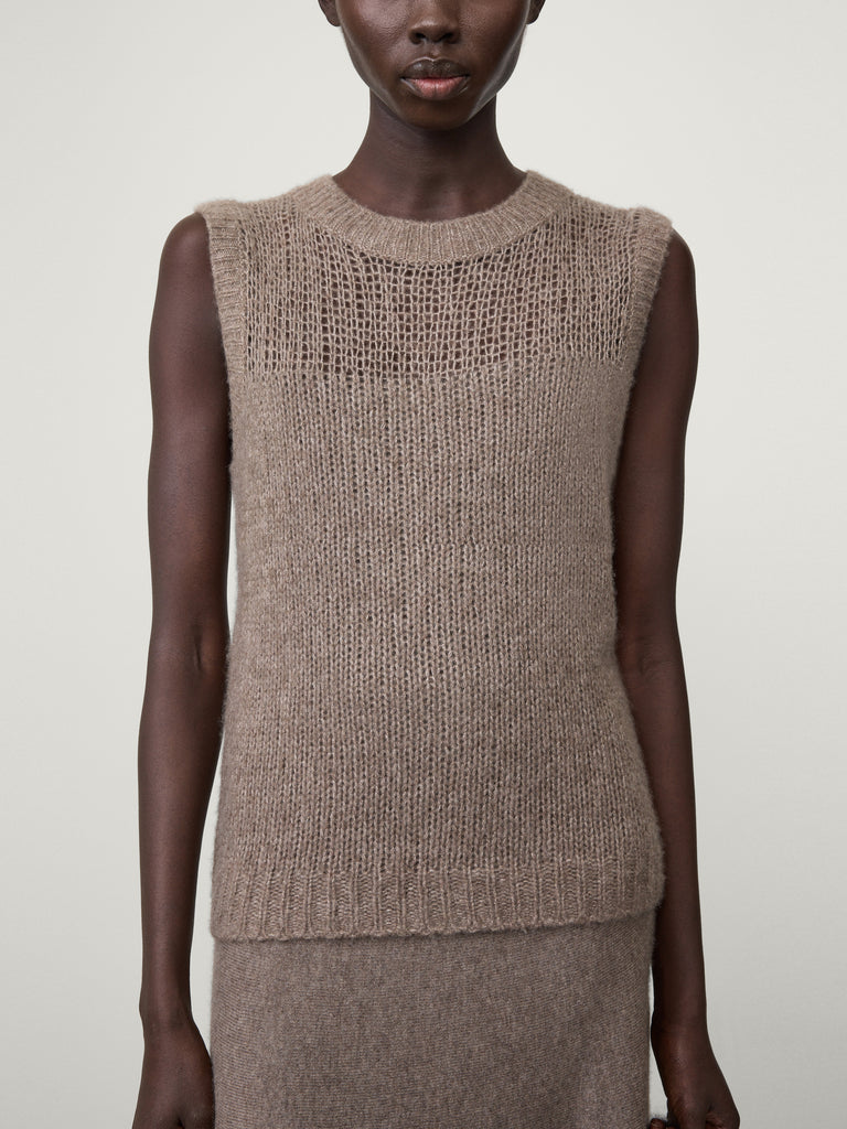 A novel silhouette, the Darcia top is crafted in silk cashmere with an open knit technique. The regular fit, sleeveless silhouette is defined by sheer and opaque panels knitted in two different gauges which frame the shoulders and unveil a subtle hint of skin, and finished with ribbed trims.