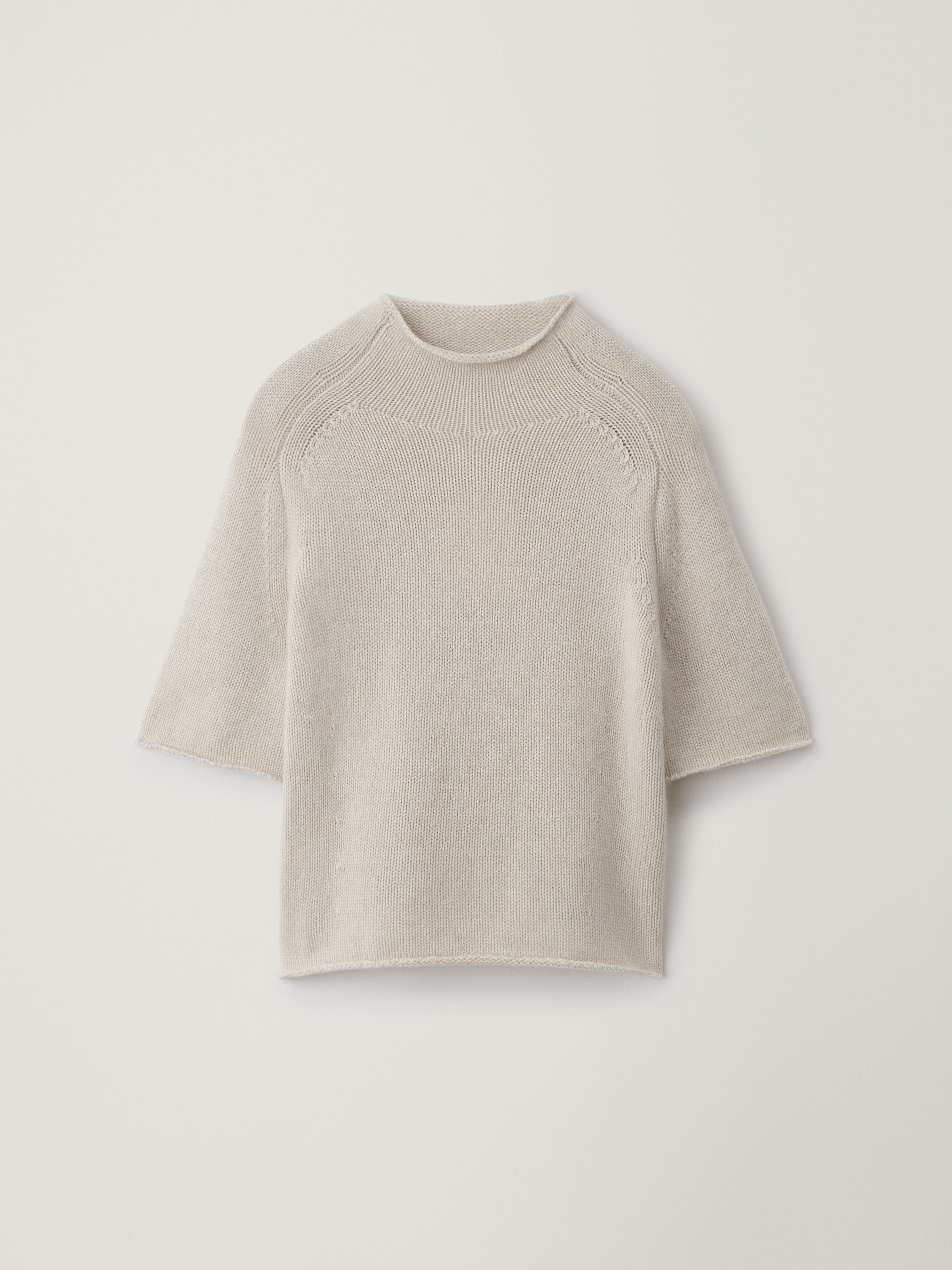 A transitional piece, the Fride sweater is crafted in our heavy knit, 5 gauge cashmere for a subtly textured feel. The regular fit, cropped silhouette has a standing mock neck, slim short sleeves and is finished with a rolled hem.