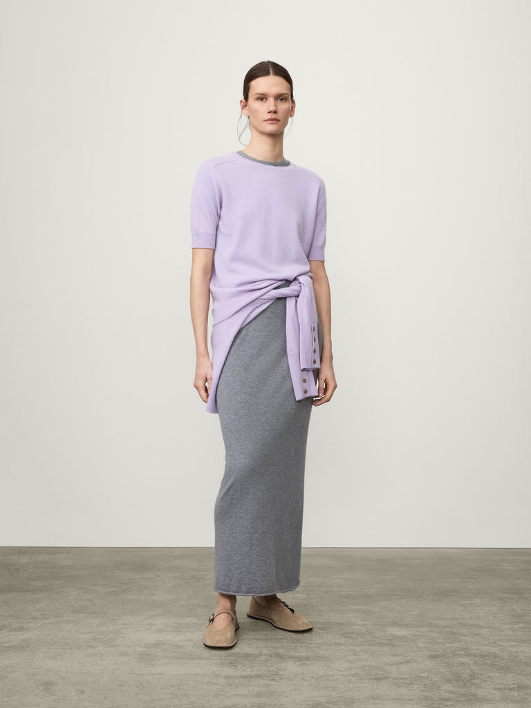 An updated staple, the Kenza T-shirt is crafted in our foundational plain knit, mid-weight cashmere. The regular fit, streamlined silhouette features a crew neck, short ranglan sleeves and ribbed trims that subtly accentuate the neckline, cuffs and hem.