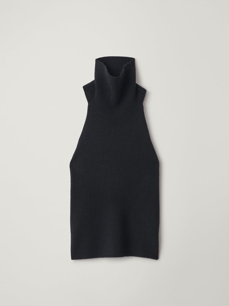 A graphic statement piece, the Maddie top is crafted in our heavy knit cashmere to a chunky look and feel. The regular fit, hip-length silhouette features a wide turtleneck, a sleeveless design with curved armholes that accentuate the shoulders, an open back and ribbed trims.
