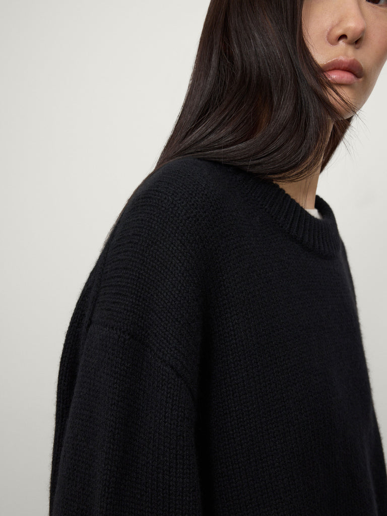 A LISA YANG signature, the Renske sweater is crafted in rich, densely knit cashmere with a chunky hand feel. The relaxed silhouette is punctuated by a double ribbed neckline and cinched by an extended ribbed hem, adding structure and shape to the dropped shoulders and elongated sleeves.