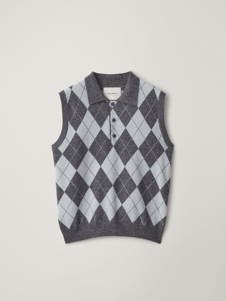 A heritage-inspired piece, the Riana top is crafted in our sparkle knit fabric: plain knit cashmere infused with glimmering threads. The regular fit, sleeveless silhouette is animated by a jacquard knit Argyle pattern and features a collared neck with a button placket and ribbed trims.