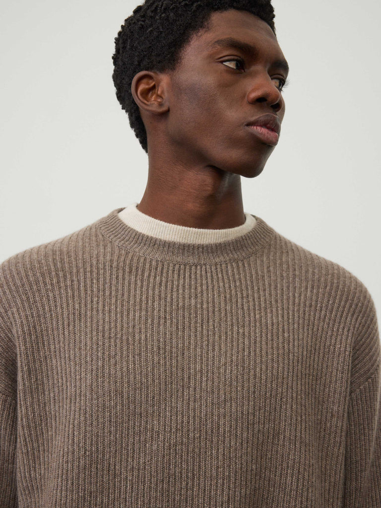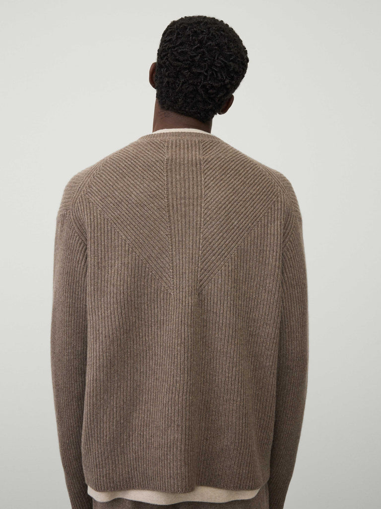 A casual ribbed sweater, the William sweater is knitted in our chunky, heavy knit cashmere with a sturdy hand feel. The relaxed fit silhouette features a round neck, dropped shoulders, full-length sleeves and ribbed trims, with a contrast ribbed pattern at the back lending it a graphic edge.